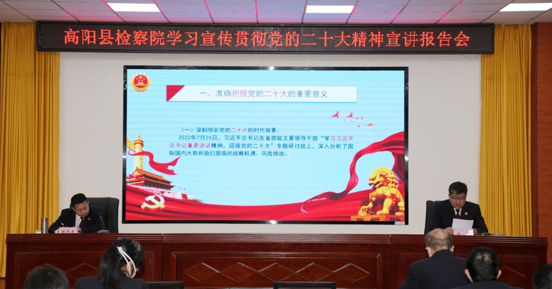 会议指出,党的二十大是在全党全国各族人民迈上全面建设社会主义现代化国家新征程、向第二个百年奋斗目标进军的关键时刻召开的一次十分重要的大会。全体干警要把学习宣传贯彻党的二十大精神作为当前和今后一个时期的首要政治任务,结合检察工作实际,抓好持续学习和贯彻落实。