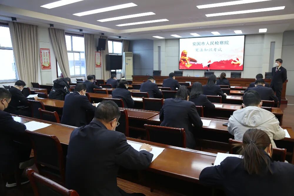 讲座结束后,为检验与会检察干警对宪法法律知识的学习掌握情况,现场组织宪法法律知识测试活动。此次宪法知识测试题内容涵盖了《宪法》、习近平法治思想、八五普法规划等内容,设置了单项选择题、多项选择题、简答题等,题型多样,以确保干警全面熟悉掌握和提升宪法法律知识。