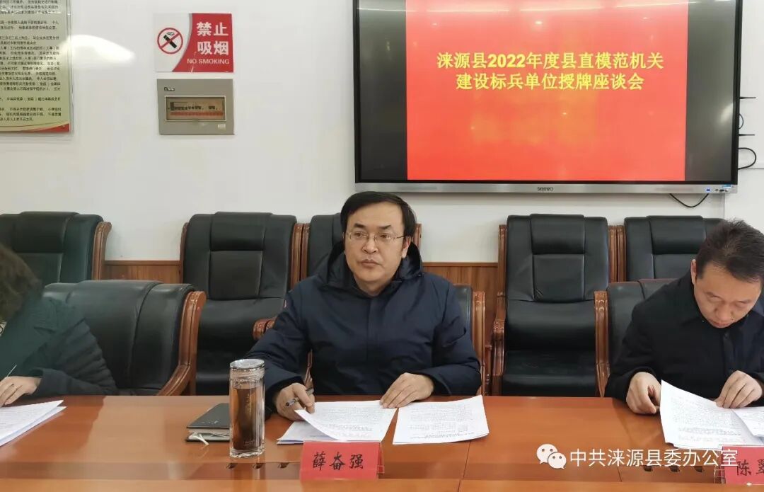 1月31日上午,我县组织召开2022年度市、县级模范机关建设标兵单位授牌座谈会。县委常委、办公室主任薛奋强出席会议并讲话。县委办党支部书记、常务副主任陈翠峰主持会议。获得“模范机关建设标兵单位”荣誉称号的相关单位主要负责同志参加会议。
