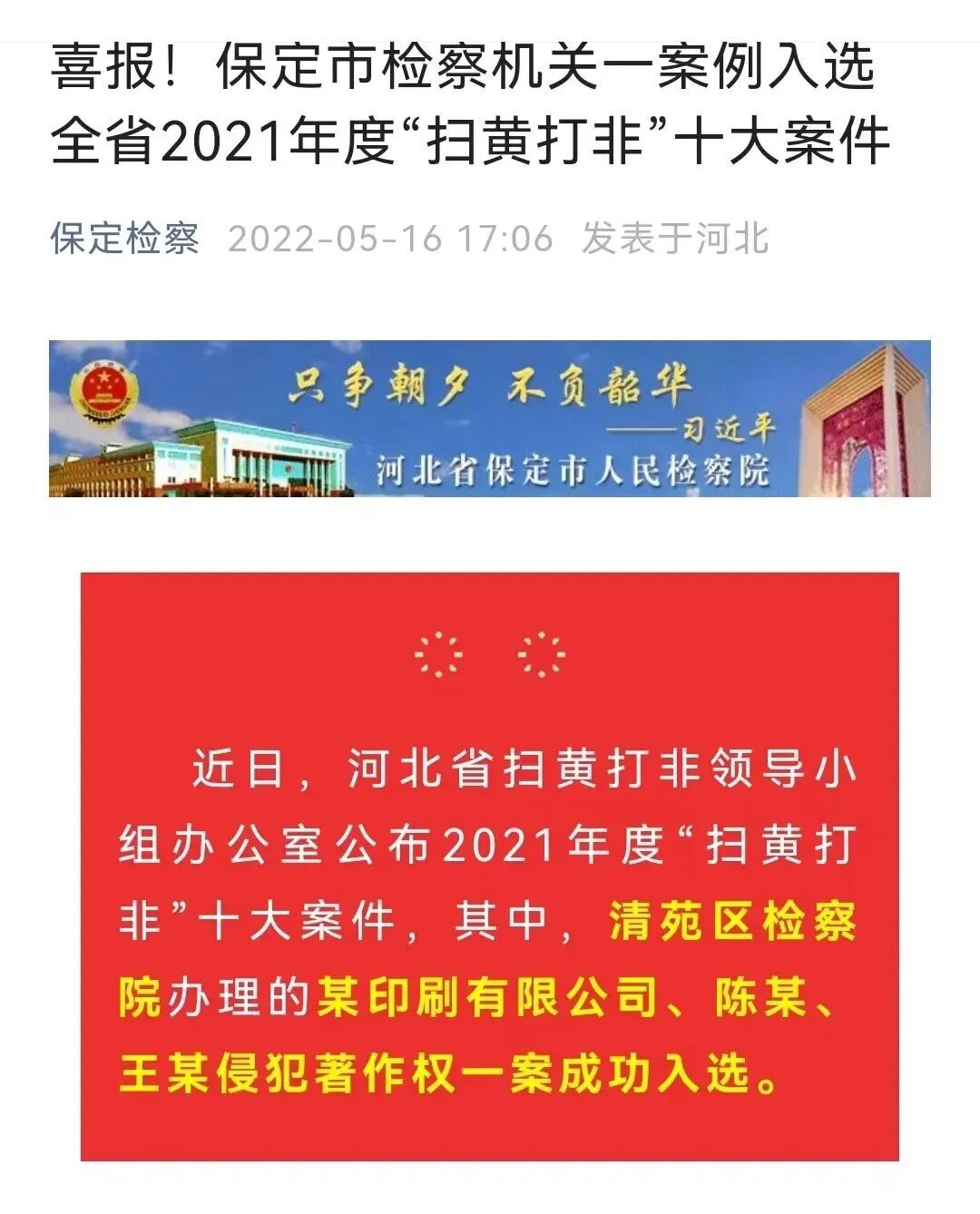 2021年清苑区检察院收到侦查机关移送的陈某、王某侵犯着作权案,案件承办检察官迅速对案件证据展开分析,及时归纳总结出案件需要继续侦查的问题,同时加强对相关知识产权领域法律法规的研究,在审查起诉期限内,迅速、高效地完成证据补充、认罪认罚等一系列工作,起诉后,清苑区人民法院全部采纳了区检察院起诉的事实、罪名及量刑建议。该案成功入选河北省扫黄打非领导小组办公室公布的2021年度“扫黄打非”十大案件。