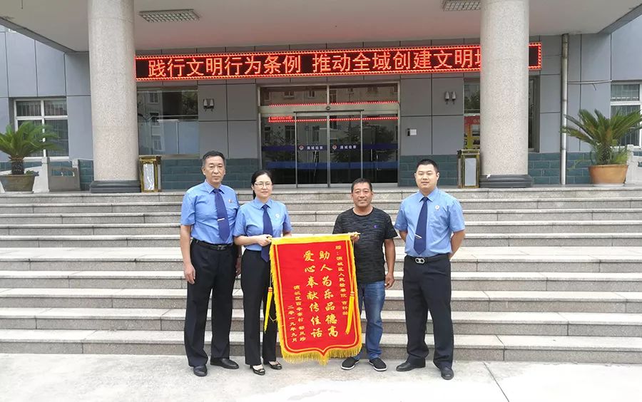 2019年9月6日,殷永安去宋贾村下乡途中,遇到有人在路上大声呼叫着拦车。前方车辆未见停车,殷永安立即停车察看情况。原来是一名交通事故的受伤人员伤情危急,拦车人说,发生事故后,打了急救电话。可这里是农村,时间就是生命。“人命关天,救人要紧!”殷永安来不及多想什么,立即和同事将伤者抬上他们驾驶的警务车辆,急速赶往城区里的人民医院。将伤者送到医院,衔接好急诊事项后,没留姓名,悄然离开医院,又立即前往下乡地点处理公务。事后,还没来得及向院里汇报出车改变行车路线的情况,结果就被院办公室给核查出助人为乐的先进事迹来了。9月12日,伤者丈夫王艳会给检察院送来了锦旗。