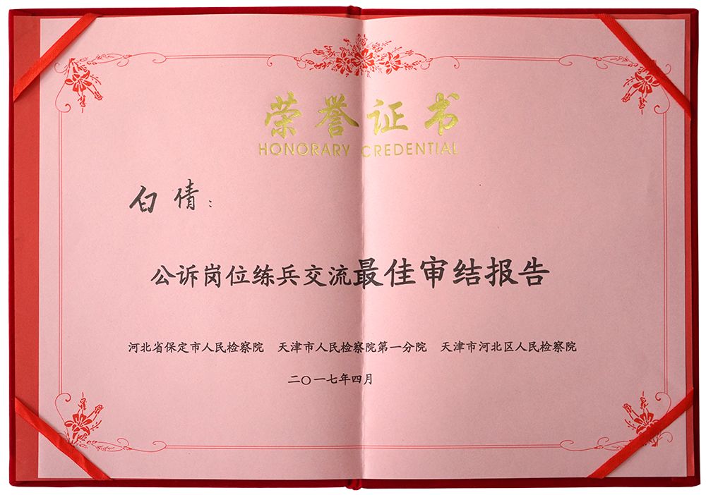她承担着本部门的内勤,并担任党支部书记,办文、办会、办事、办案全方位发展。从组织会议到起草材料,从参加活动到参与主持、宣传,在一点一滴中历练成长。多次被评为“优秀公诉人”、“先进个人”、“优秀共产党员”,并多次在保定市直工委、市院举办的演讲比赛、征文比赛中获奖。