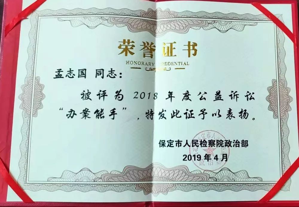 检察公益诉讼工作是一项利国利民的事业,孟志国在莲池区检察院民行部门履职尽责,做出实绩,为社会公益贡献了自己的力量。