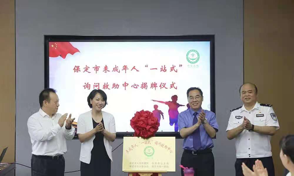 王庆品、段秀丽、张广、齐峰共同为保定市未成年人“一站式”询问救助中心揭牌。