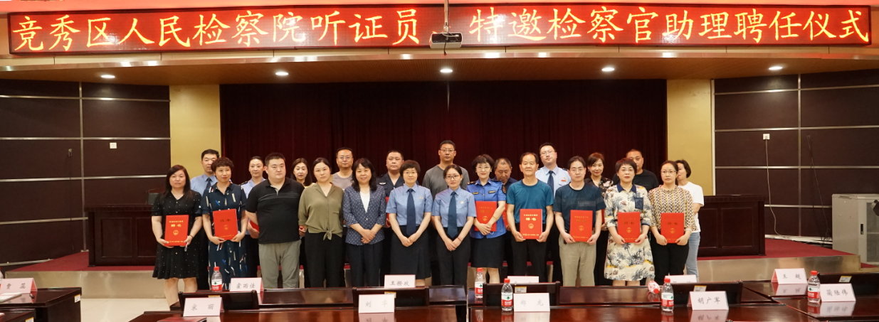 为深入贯彻落实《中共中央关于加强新时代检察机关法律监督工作的意见》和高检院《人民检察院听证员库建设管理指导意见》《专业人员兼任检察官助理工作办法》等文件精神,提高办案的专业化水平,切实促进司法公开、保障司法公正,5月25日,竞秀区人民检察院举行听证员、特邀检察官助理聘任仪式。区人大副主任胡春华、政法委副书记赵凌雁、政协办公室副主任王韬出席仪式。