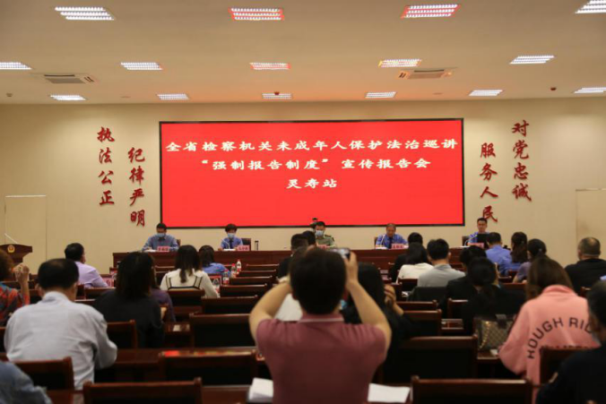 河北省军地检察机关在灵寿县公安局联合组织强制报告制度宣讲报告会,省法治巡讲团的检察官围绕强制报告制度的相关规定、具体案例,以及新修订《未成年人保护法》“六大保护”等内容进行授课。