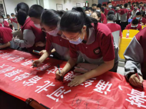 在河北军地检察机关联合组织宣讲活动中,同学们在“护苗、绿书签行动”横幅上签名。