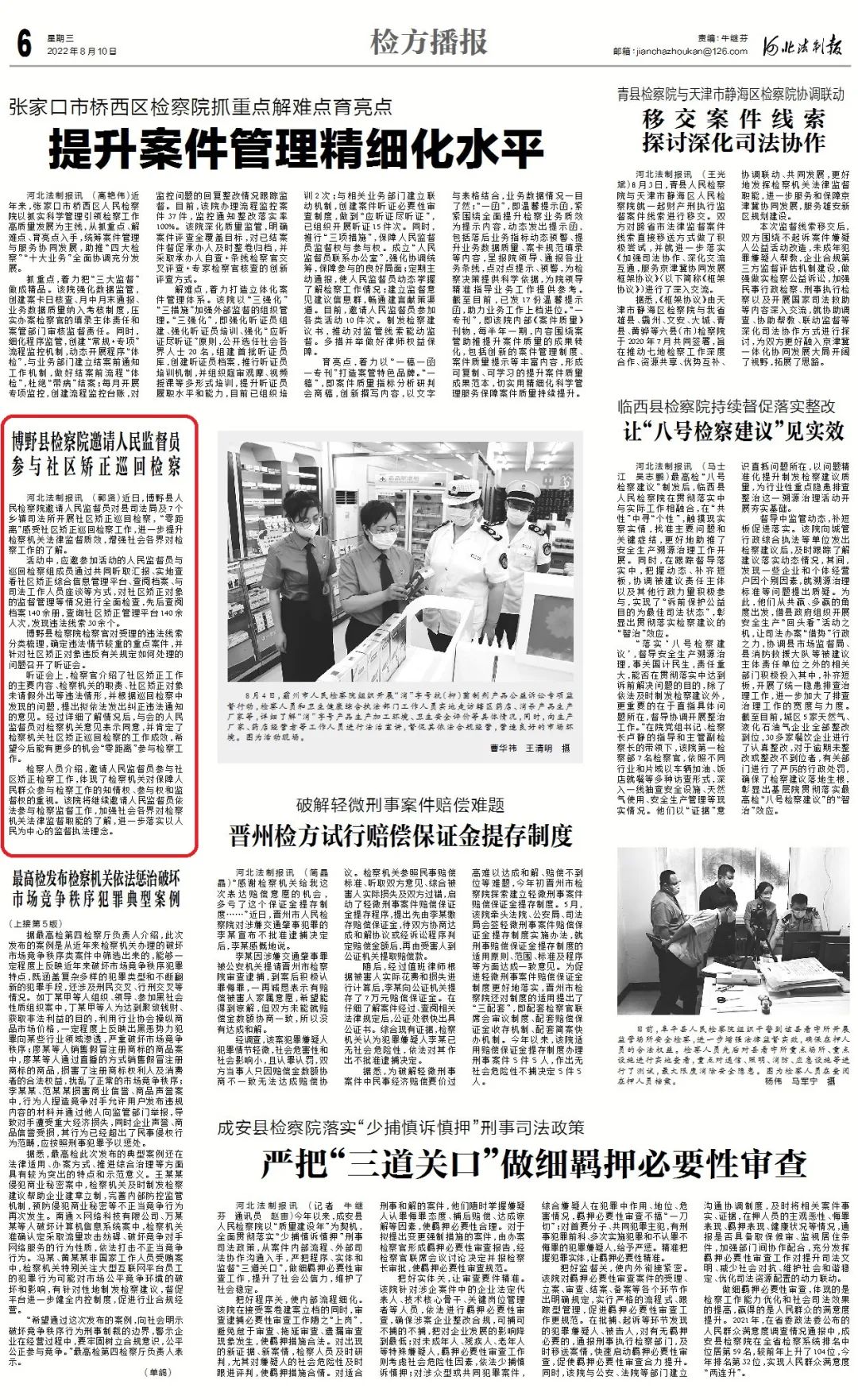 近日, 博野县人民检察院邀请人民监督员对县司法局及7个乡镇司法所开展社区矫正巡回检察,“零距离"感受社区矫正巡回检察工作,进一步提升检察机关法律监督质效,增强社会各界对检察工作的了解。活动中,应邀参加活动的人民监督员与巡回检察组成员通过共同听取汇报、实地查看社区矫正综合信息管理平台、查阅档案、与司法工作人员座谈等方式,对社区矫正对象的监督管理等情况进行全面检查,先后查阅档案140余册,查询社区矫正管理平台140余人次,发现违法线索30余个。博野县检察院检察官对受理的违法线索分类梳理,确定违法情节较重的重点案件,并针对社区矫正对象违反有关规定如何处理的问题召开了听证会。听证会上,检察官介绍了社区矫正工作的主要内容、检察机关的职责、社区矫正对象未请假外出等违法情形,并根据巡回检察中发现的问题,提出拟依法发出纠正违法通知的意见。经过详细了解情况后,与会的人民监督员对检察机关意见表示同意,并肯定了检察机关社区矫正巡回检察的工作成效,希望今后能有更多的机会“零距离”参与检察工作。检察人员介绍,邀请人民监督员参与社区矫正检察工作,体现了检察机关对保障人民群众参与检察工作的知情权、参与权和监督权的重视。该院将继续邀请人民监督员依法参与检察监督工作,加强社会各界对检察机关法律监督职能的了解,进一步落实以人民为中心的监督执法理念。