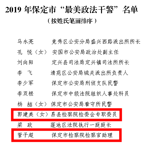 日前,由中共保定市委政法委组织开展的2019年保定市“最美政法干警”推选展示活动评选结果揭晓。经过基层推选、公开投票、综合审定,最终确定10名“最美政法干警”, 20名同志获得“最美政法干警”提名奖。