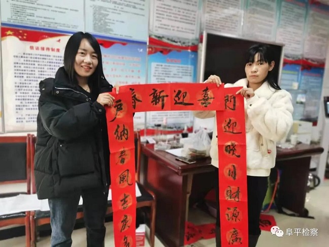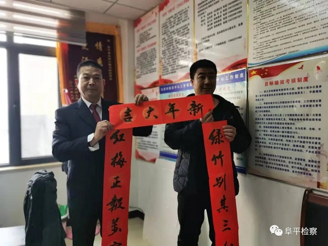 “丰产丰收岁岁甜,多劳多得人人乐”、“新春新喜新世纪,大顺大财大吉利”.....接过一幅幅饱蘸深情的春联,到场的村民们脸上洋溢着幸福的笑容。活动中,阜平检察干警还围绕党的十九届六中全会精神为到场的村民们答疑解惑,引导群众接续奋斗、共创美好生活。