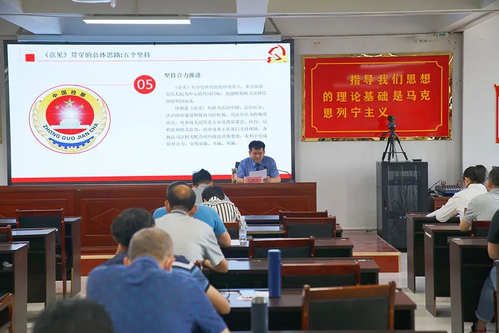 王进文检察长从《意见》出台的背景和意义、总体思路、主要内容以及《意见》对检察机关如何定位等多个方面进行了详细阐述,并结合检察工作实际,围绕“检察机关如何为大局服务、为人民司法”从五个方面提出了自己的建议。授课结合大量具体案例,内容生动、丰富,让参会的领导干部们对《意见》的精神内涵和高碑店市院的检察实践工作有了全面深入的了解,为进一步凝共识、聚合力加强新时代检察机关法律监督工作打下了坚实基础。