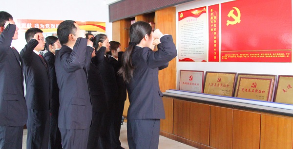 “我志愿加入中国共产党,拥护党的纲领,遵守党的章程,履行党员义务,执行党的决定......”干警们面向党旗坚定地举起右手庄严宣誓,重温入党誓词。