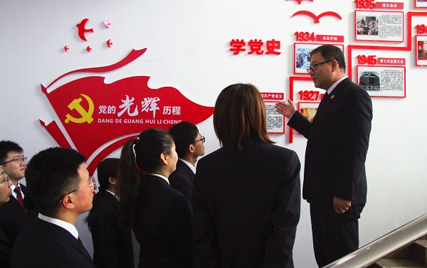 在高阳县检察院党建文化长廊,从党的一大到党的十九大,党支部副书记苏坤飞为在场的党员干警介绍党的百年历程,共同回顾中国共产党人为了民族独立、人民解放,国家富强、人民富裕所做的奋斗和牺牲。
