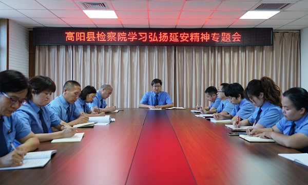 2022年8月15日,高阳县检察院“阳光讲堂”组织开展延安精神专题学习。党组书记、检察长安通结合在延安培训期间的所学所思所悟进行讲授,全体班子成员及中层干警参加。