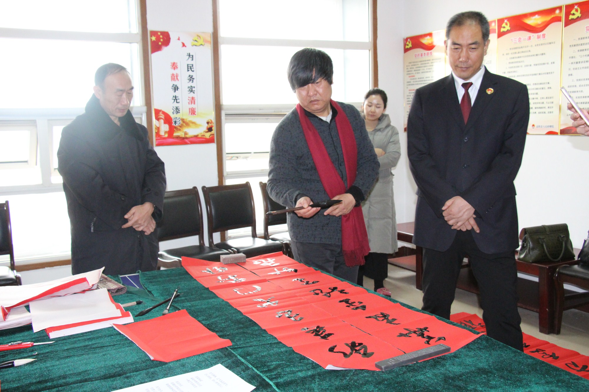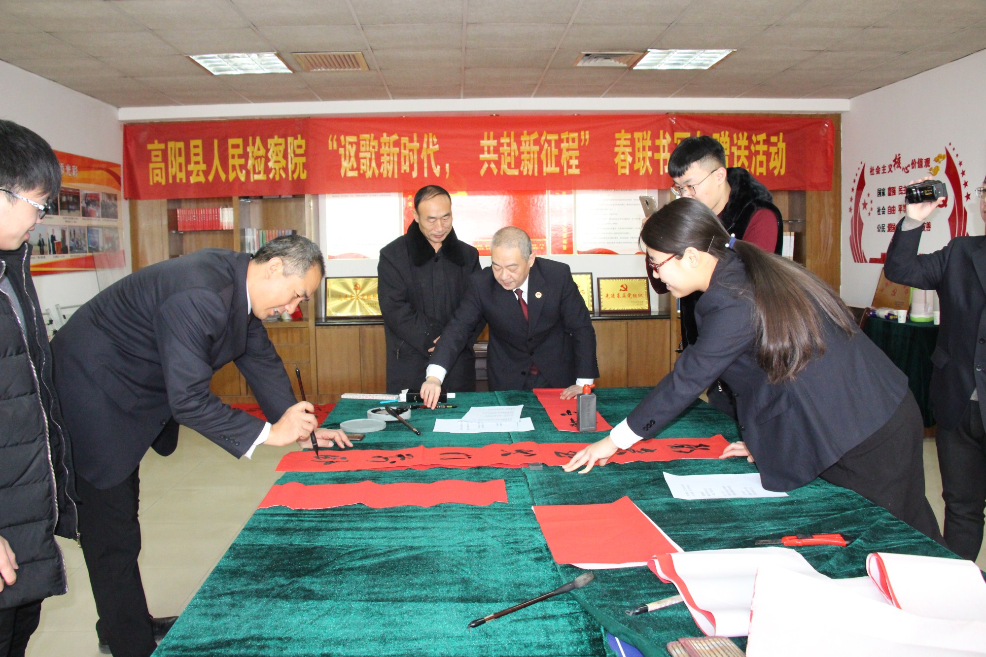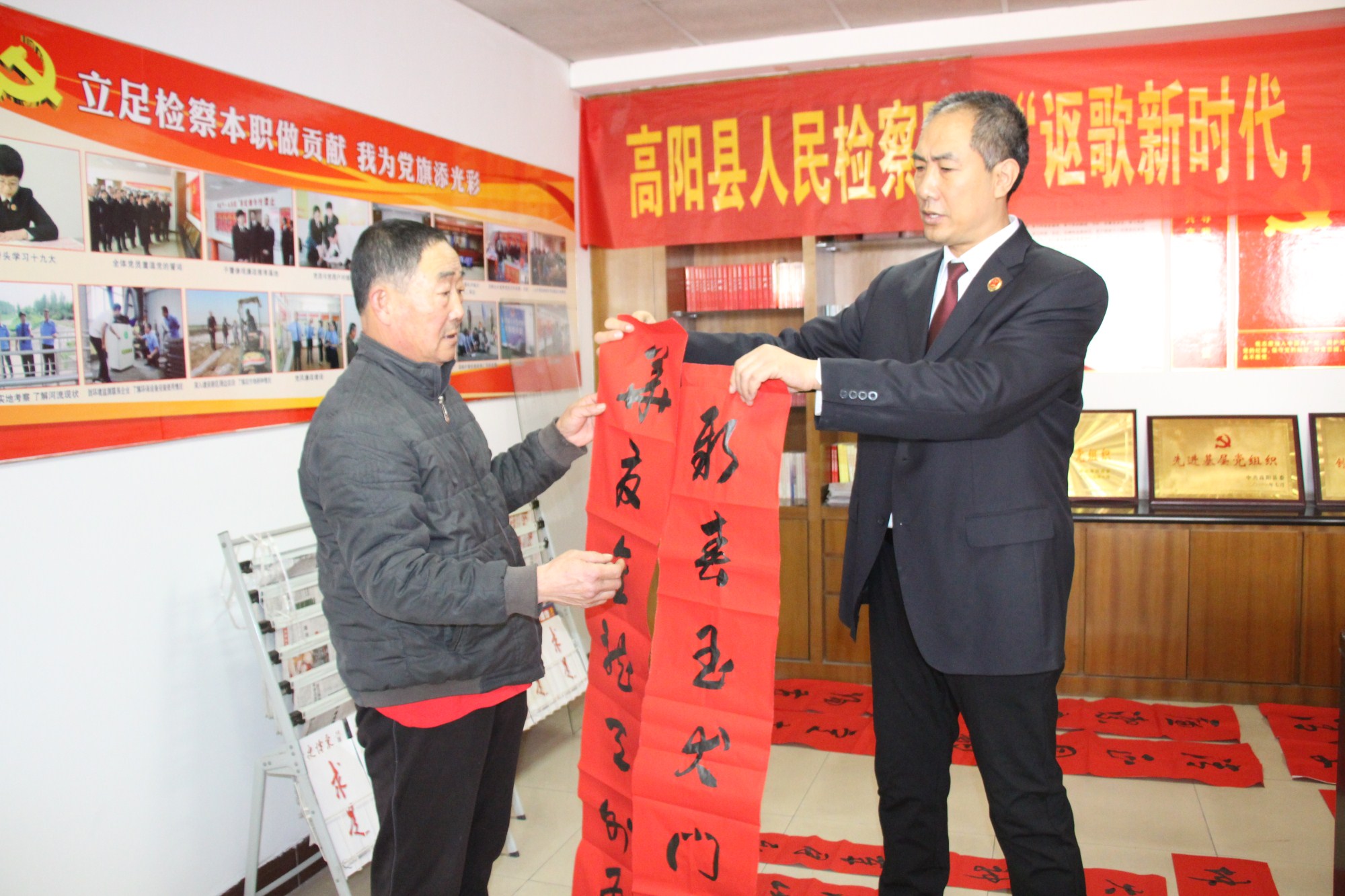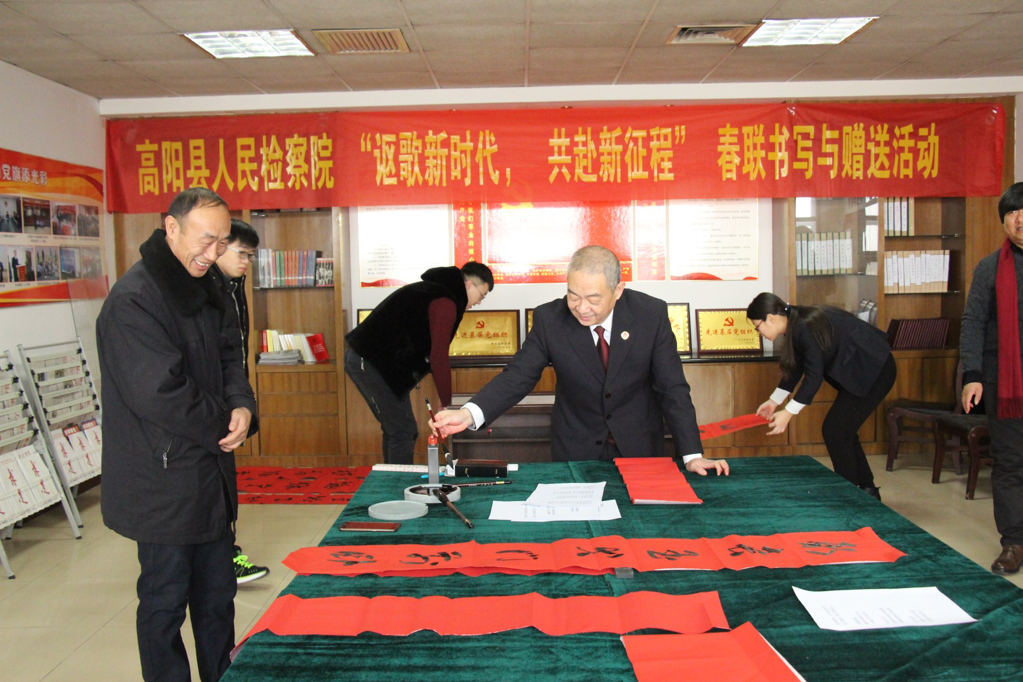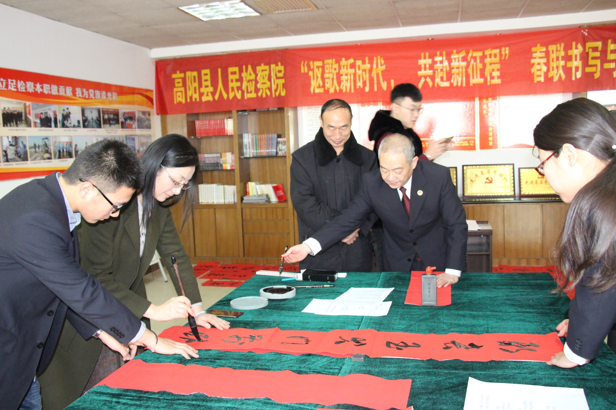 为进一步深化高阳县人民检察院学习党的十九大精神活动成果,增添浓厚的节日氛围,塑造风清气正的检察形象,2018年2月8日,高阳县人民检察院举办了“讴歌新时代、共赴新征程”春联书写与赠送活动,将书写好的春联作为礼品进行对口帮扶和走访慰问。