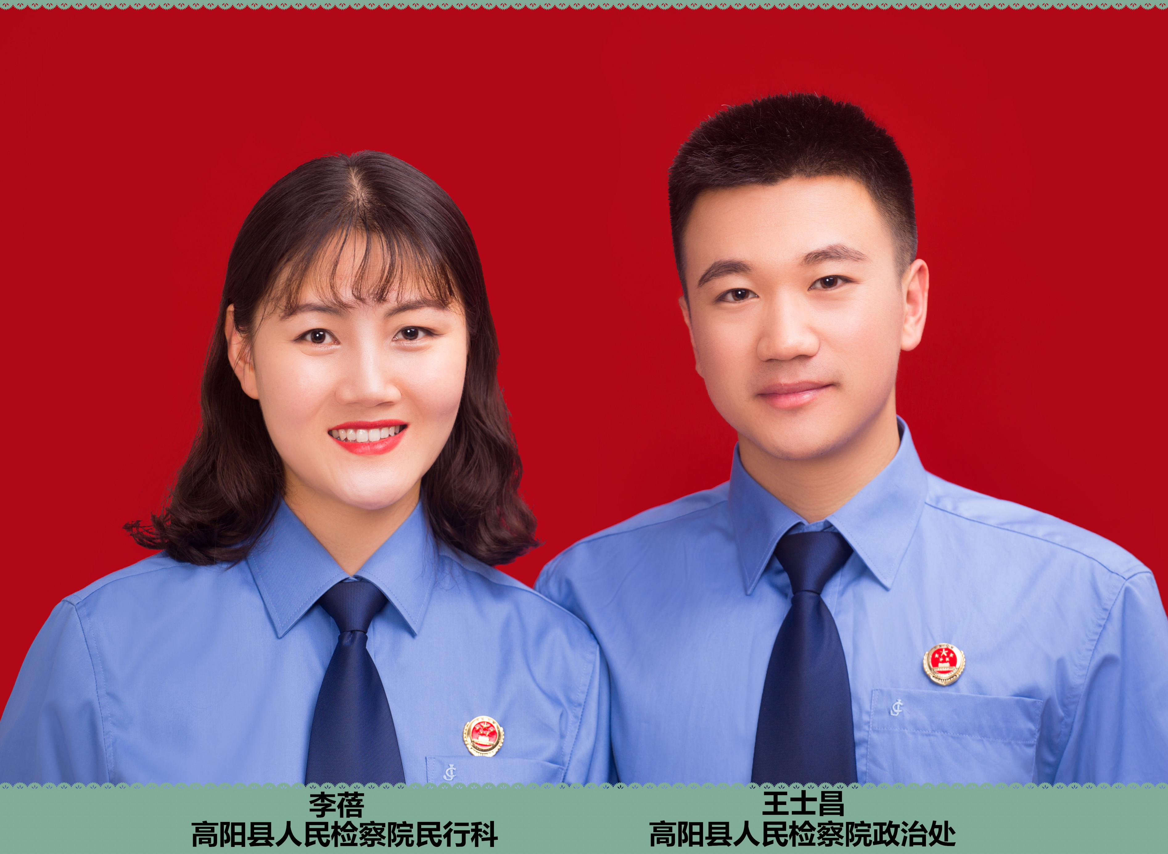王士昌、李蓓夫妇二人于2017年同时考入高阳县人民检察院,命运中的缘分迅速将两个人联结在一起,他们从相识、相知慢慢地走到了相爱、相守,两个人在工作上志同道合,在生活中相互扶持。他们因检察而结缘:“你说不喜欢穿白衬衫,最爱的是检察蓝,那我便陪你把它穿成一辈子的情侣衫。”