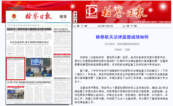 近日,检察日报头版刊发《检察机关法律监督成效如何 河北保定:组成观摩团现场验收》一文,对保定市检察院邀请各地县(市、区)的县委书记、县长以及基层检察院检察长组成观摩团现场考评验收法律监督工作成效进行了宣传报道。