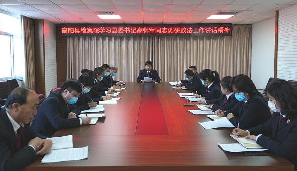 2月18日,县委书记高怀军同志对政法工作开展专题调研,听取县政法各单位工作情况汇报,并就今年工作提出具体要求。调研结束后,高阳县检察院立即组织专题会议学习贯彻高怀军同志重要讲话精神,并就全年工作进行安排部署。会议由院党组书记、检察长安通主持,中层以上干警参加。