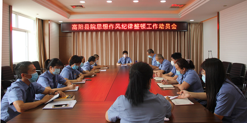 6月23日,保定市院和高阳县委相继召开思想作风纪律整顿工作会议,会议结束后,高阳县检察院第一时间组织召开思想作风纪律整顿工作动员会,院领导班子成员、中层以上干警参加会议。