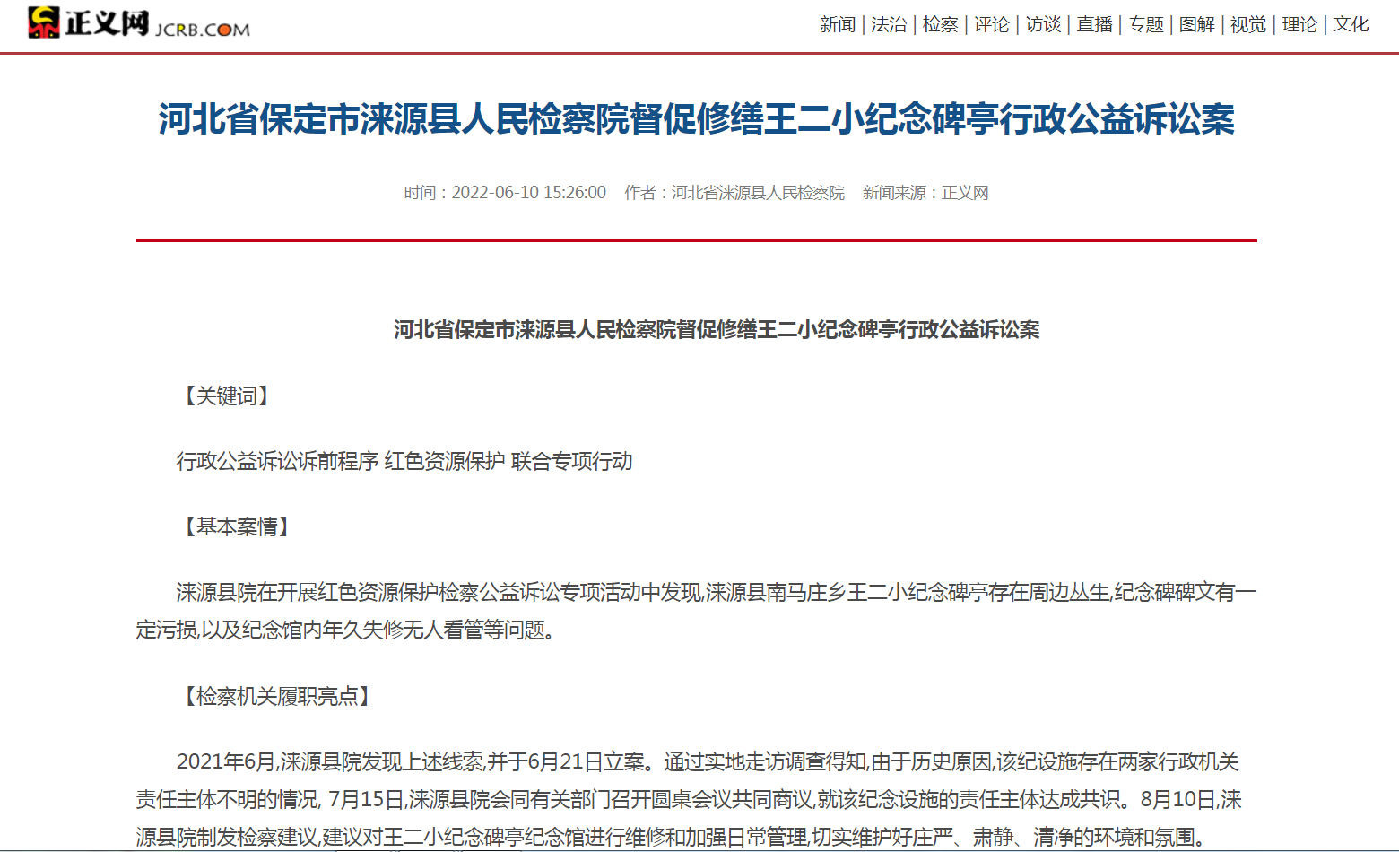 近日,正义网刊登涞源县检察院《河北省保定市涞源县人民检察院督促修缮王二小纪念碑亭行政公益诉讼案》