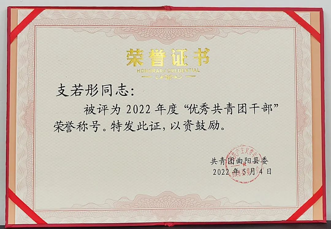 2022年中国共青团成立100周年。近日,共青团曲阳县委作出表彰决定,表彰全县五四红旗团支部、优秀共青团干部。其中,曲阳县人民检察院团支部荣获“曲阳县五四红旗团支部”称号,干警支若彤荣获“优秀共青团干部”荣誉称号。