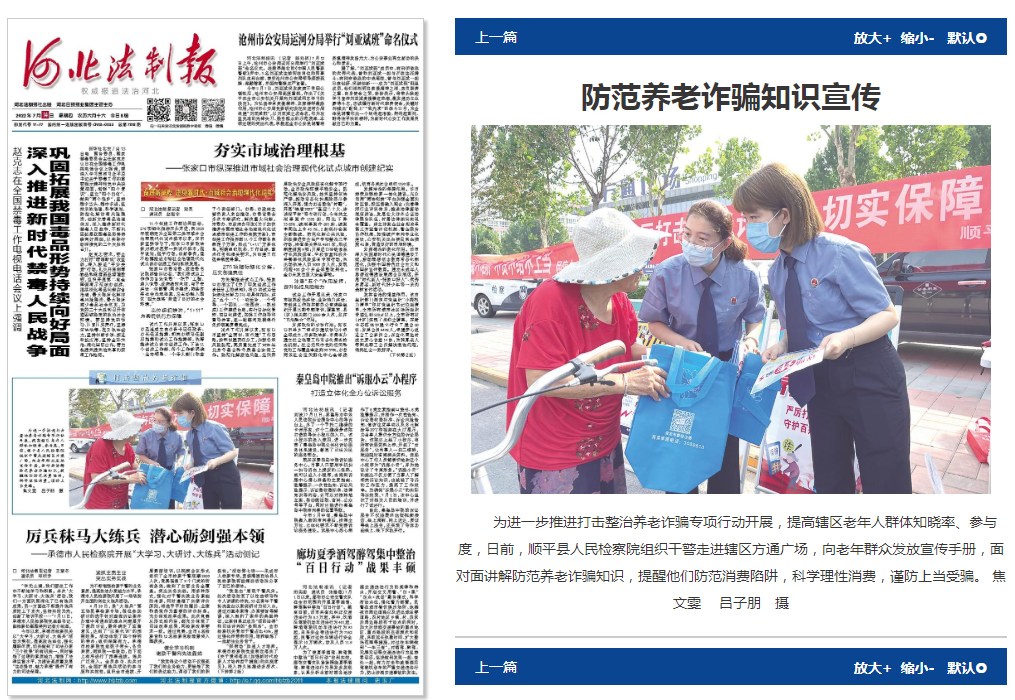 7月14日,我院防范养老诈骗知识宣传活动被河北法制报头版刊发。