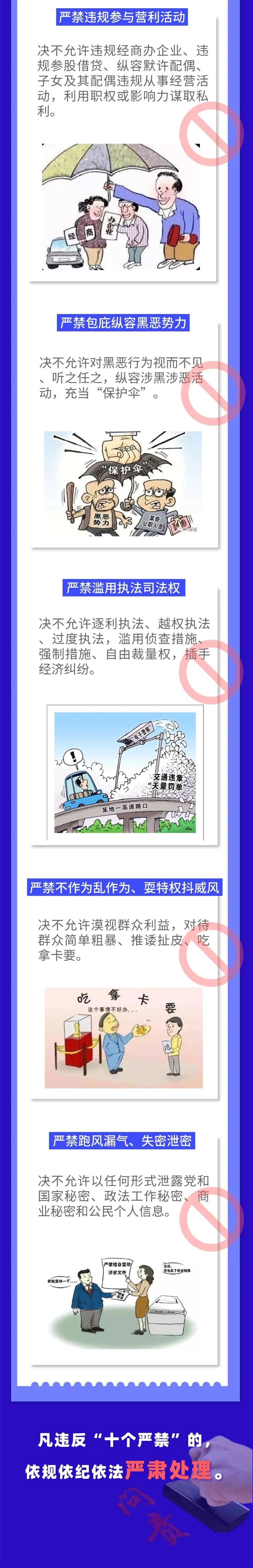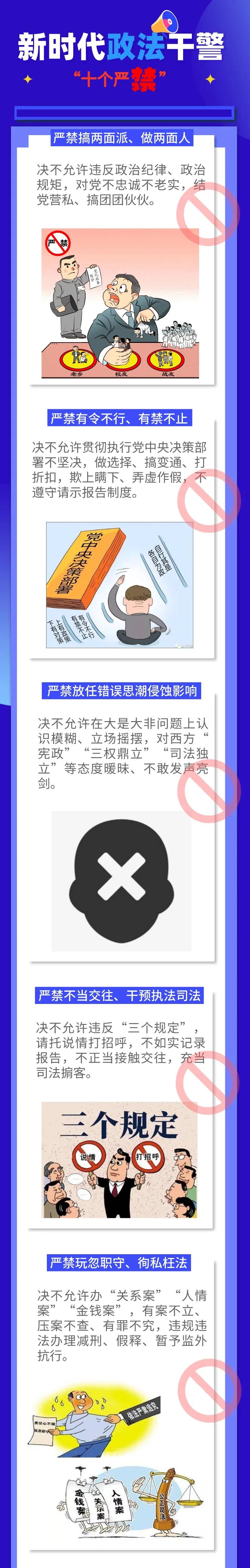近日,中央政法委、最高人民法院、最高人民检察院、公安部、国家安全部、司法部联合印发了《新时代政法干警“十个严禁”》。“十个严禁”划定了政法干警的思想“红线”和行为“底线”,是全国政法队伍教育整顿的重要制度成果,也是推进全面从严管党治警的重要举措。