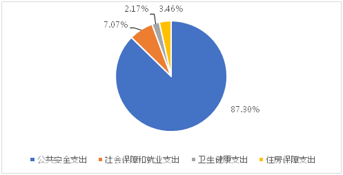 2019 年度财政拨款支出1027.56万元,主要用于以下方面:公共安全支出897.11万元,占87.30%,;社会保障和就业支出72.61万元,占7.07%;卫生健康支出22.33万元,占2.17%;住房保障支出35.51万元,占 3.46%;
