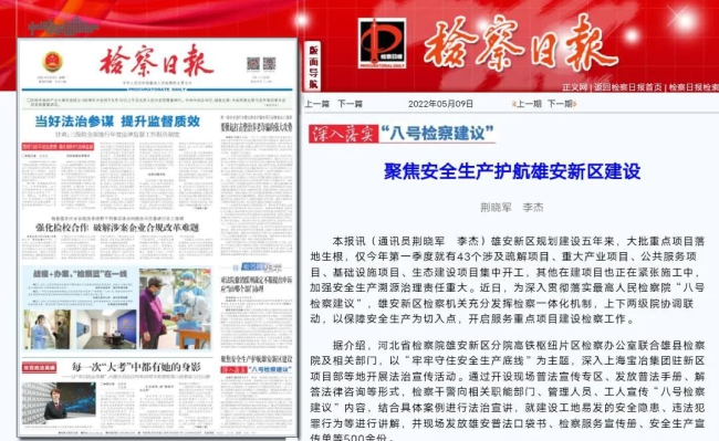 5月9日,《检察日报》头版刊发《聚焦安全生产护航雄安新区建设》一文,报道了雄安新区检察机关深入贯彻落实“八号检察建议”,充分发挥检察一体化机制,上下两级院协调联动,以保障安全生产为切入点,开启服务重点项目建设检察工作。